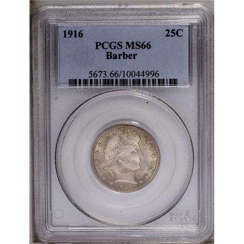 <B>1916<25C> MS66 PCGS.</B></I> Sharply struck with shimmering luster and well preserved surfaces that are nearly pristine. Lovely olive, tan, russet and light-gray coloration adorns each side of the piece. The final year of the Barber quarter series, when the first Standing Liberty coins were also struck. Population: 18 in 66, 3 finer (4/06).