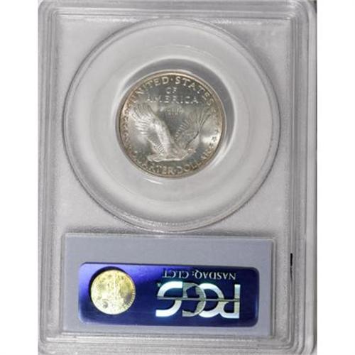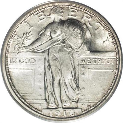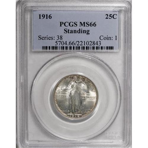 <B>1916 25C MS66 PCGS.</B></I> Though Philadelphia struck 52,000 Standing Liberty quarters in 1916, distribution did not take place until 1917. By combining the previous year's emission with examples of the 1917-dated Type One quarter, the distributors masked the rarity of the 1916-dated pieces. Unfortunately for numismatists, this gambit succeeded, and as a consequence, Mint State Standing Liberty quarters from the first year of issue are highly elusive.<BR> This pleasing Premium Gem is minimally toned save for a whisper of gold near the upper reverse rim. The upper part of Liberty shows slight softness overall, and the head is weak, but elsewhere, the overall definition is solid. Carefully preserved and immensely appealing. Population: 7 in 66, 0 finer (2/08).<BR><BR><b>Shipping:</b> Coins & Currency (<a target="_blank" href="http://www.heritageauctions.com/common/shipping.php">view shipping information</a>)