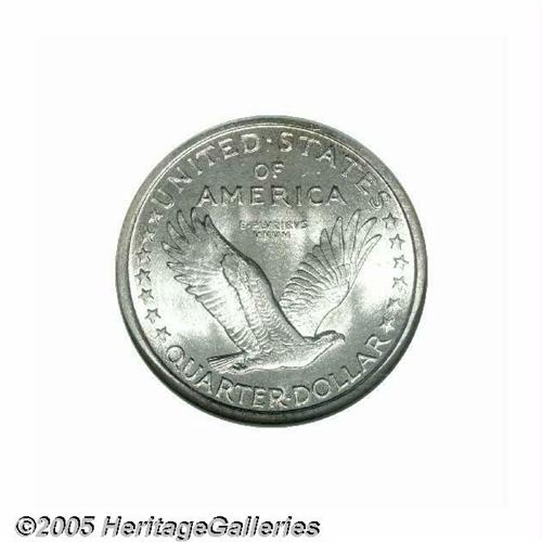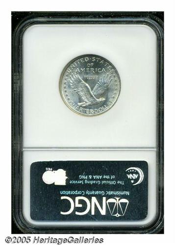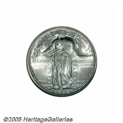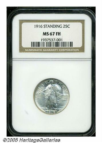 <B>1916<25C> MS67 Full Head NGC.</B></I> The 1916 Standing Liberty quarter is a curious issue. Few examples (in absolute terms) were set aside at the time of issue, making this a seldom-encountered date in all grades. However, because of the high prices this issue commands in all grades, it is generally available in major auctions, which makes it seem more available than it really is. In the ultimate grade of MS67, though, there can be no doubt about the rarity of the 1916 quarter. Heritage handles tens of millions of dollars in rare coins each year, and it has been five years since we have offered an MS67 1916 quarter for sale at public auction. Only six pieces have been certified as MS67 by the two major services--two by NGC and four by PCGS, and none are finer (5/05).<BR> Much has been speculated about the redesign of the Type One Standing Liberty quarter. Most of that speculation centers around the alleged "indecency" of the exposed breast of Liberty, speculation that persists to this day. Novice historians (including Walter Breen) have tended to overstate the role of the Society for the Suppression of Vice in the redesign process. In reality, someone with considerably more political clout was responsible for the design change. On April 16, 1917, Treasury Secretary William G. McAdoo had written to Representative William Ashbrook of Ohio in protest to the Type One quarter design. On April 30, Ashbrook introduced McAdoo's bill before Congress. The document called upon the Mint to modify the original design by increasing the concavity of the fields and repositioning the eagle with relation to the stars. To support this legislation, McAdoo asserted (albeit erroneously) that the Type One coins would not stack properly. This proposal became Public Law 27 on July 9, 1917 and specified that no major changes should be made to the design other than those specifically stated. Since the approved modifications would have had a definite effect on the stacking qualities of the quarters, why did the Mint circumvent the law and further modify MacNeil's original design? While many numismatists see the jealous hand of Chief Engraver Barber at work, the real culprit was actually McAdoo himself, who had married President Woodrow Wilson's daughter in 1914. Through this familial alliance, as well as his position as Secretary of the Treasury, McAdoo hoped to springboard himself into the White House after Wilson stepped down. However trivial the complaints from the Society for the Suppression of Vice may have seemed to many Americans, an aspiring politician such as McAdoo could not afford to ignore them. Accordingly, the Treasury Secretary fabricated the charge of improper stacking to mask his real intentions. While the Mint did carry out the authorized modifications, it also significantly altered the basic design by using a chain mail vest to cover Liberty's exposed breast. The Treasury Department did not even attempt to modify Public Law 27 to reflect this change, but it did enter into the Congressional Record the fact that McAdoo did not like the Type One design--the only statement of truth in the entire process. While McAdoo's presidential hopes were dashed in the elections of both 1920 and 1924, the illegal changes he ordered for the Standing Liberty quarter remained in use until the design was retired in 1930.<BR> This is a truly amazing 1916 quarter. It is, in fact, a truly amazing Standing Liberty quarter regardless of date. Brilliant throughout, the surfaces exude a thick mint frost that rolls around each side unimpeded by the post-striking defects one would expect on a lower graded coin. The striking details are especially notable, especially for a 1916 quarter, with strong horizontal shield lines, unusually sharp definition on the ear, neck, and throat of Liberty, and a sharp line separating the hair. This is a very rare opportunity for the specialist that should be carefully considered as this date is seldom offered for sale in such a superior state of preservation.