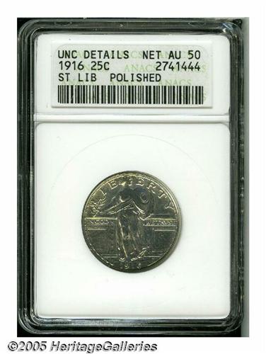 <B>1916<25C>--Polished--ANACS. Unc Details, Net AU50.</B></I> A sharply detailed example of this scarce, first-year issue with minimal evidence of actual handling. The surfaces are bright from polishing and there is hardly a trace of color to be seen. An affordable example of this popular 20th century date.