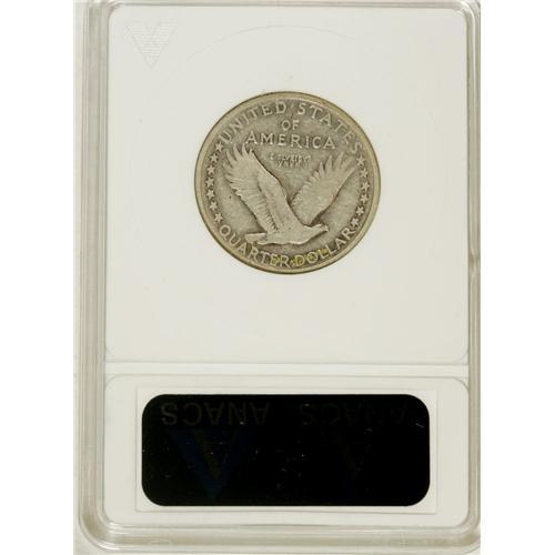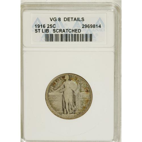 <B>1916 25C --Scratched--ANACS. VG8 Details.</B></I> Glimpses of ice-blue, gold, and fire-red are largely confined to the peripheries. The date is faint, but all four digits are evident. A hair-thin diagonal mark across Liberty's waist is of little relevance, although a cluster of small abrasions are present beneath VNVM.<BR><BR><b>Shipping:</b> Coins & Currency (<a target="_blank" href="http://www.heritageauctions.com/common/shipping.php">view shipping information</a>)