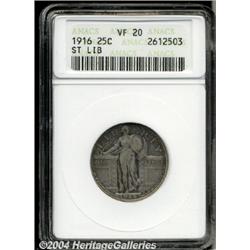 <B>1916<25C> VF20 ANACS.</B></I> An affordable mid-grade example of this always popular key-date, with only 52,000 pieces struck. Pleasing slate-gray original toning blankets both sides, and nice detail shows for the grade, including the date which is well defined. A few small to moderate abrasions are found on either side, but are for the most part not immediately noticeable due to their being toned over.<BR><I>From The Paulsboro Collection.</B></I> <BR><BR><B>Important notice:</B> Heritage usually auctions material at the rate of 200-250 lots per hour. On some occasions eBay Live bid software or the Internet may not be able to keep up with the pace of the auction. We recommend placing a realistic absentee bid now as insurance to avoid disappointment. Occasionally the auctioneer may eliminate or reject an eBay Live bid, and the auctioneer may also reopen a lot after the close of the eBay live bidding (usually because we missed an audience bid), and may reject your bid even if it shows you as the winning bidder. By bidding via eBay Live, you agree that Heritage may award the lot to another bidder at its sole discretion under the circumstances described above or any other reasonable circumstances. Since eBay bids are not shown to us until we open the lot on the floor, we treat those bids just like floor bids. In most cases the floor responds before the eBay bid is presented to us, due to Internet lag time, so for consistency we have made it a policy that floor bids are always considered first over tie eBay live bids. Also please note that all Heritage lots purchased through eBay Live carry a 20% Buyer's Premium. Please make sure you read the Terms and Conditions before you bid.