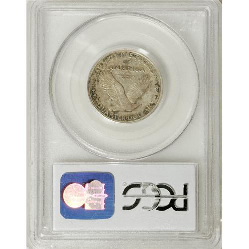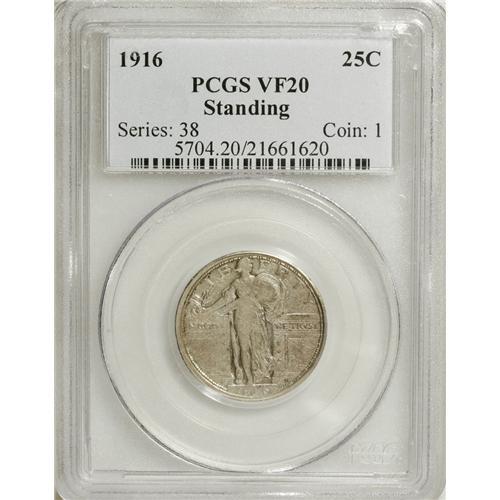 <B>1916 25C VF20 PCGS.</B></I> All four date digits are fully legible, and the lower half of the date is bold. The eagle's front wing displays considerable definition, and IN GOD WE TRVST is sharp. The gunmetal-gray and gold toning is moderate, and there are no individually mentionable marks. The tiny mintage of 52,000 pieces has always ensured the key date status of this first-year issue.<BR><BR><b>Shipping:</b> Coins & Currency (<a target="_blank" href="http://www.heritageauctions.com/common/shipping.php">view shipping information</a>)