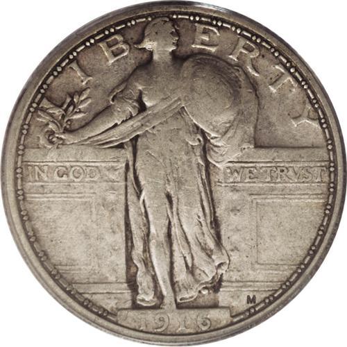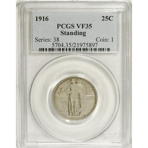<B>1916 25C VF35 PCGS.</B></I> A well balanced medium gray example with traces of deeper color at the borders of both sides. The tops of the digits in the date are a trifle indistinct as a result of their high placement on the design. Other than a few minor slidemarks on Liberty's legs, there are no mentionable abrasions or other distractions on either side. Mid-grade representatives of this classic first year key are on countless want lists.<BR><BR><b>Shipping:</b> Coins & Currency (<a target="_blank" href="http://www.heritageauctions.com/common/shipping.php">view shipping information</a>)