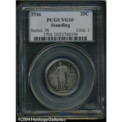 1916 25C VG10 PCGS. Light to medium gray with a so <B>1916 25C VG10 PCGS.</B></I> Light to medium gray with a solid four-digit date, although a trifle worn at the tops of the digits. Medium gray color dominates each side with deeper charcoal accents in the protected areas. Quality such as this is often stretched to Fine on this sought-after transitional key. <BR><BR><B>Important notice:</B> Heritage usually auctions material at the rate of 200-250 lots per hour. On some occasions eBay Live bid software or the Internet may not be able to keep up with the pace of the auction. We recommend placing a realistic absentee bid now as insurance to avoid disappointment. Occasionally the auctioneer may eliminate or reject an eBay Live bid, and the auctioneer may also reopen a lot after the close of the eBay live bidding (usually because we missed an audience bid), and may reject your bid even if it shows you as the winning bidder. By bidding via eBay Live, you agree that Heritage may award the lot to another bidder at its sole discretion under the circumstances described above or any other reasonable circumstances. Since eBay bids are not shown to us until we open the lot on the floor, we treat those bids just like floor bids. In most cases the floor responds before the eBay bid is presented to us, due to Internet lag time, so for consistency we have made it a policy that floor bids are always considered first over tie eBay live bids. Also please note that all Heritage lots purchased through eBay Live carry a 20% Buyer's Premium. Please make sure you read the Terms and Conditions before you bid. This lot is being auctioned in conjunction with a live floor auction by Heritage Galleries & Auctioneers. All final auction and invoice information will be supplied by Heritage Galleries & Auctioneers, and all other information should be considered preliminary. Lot:5926