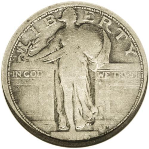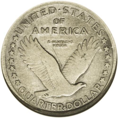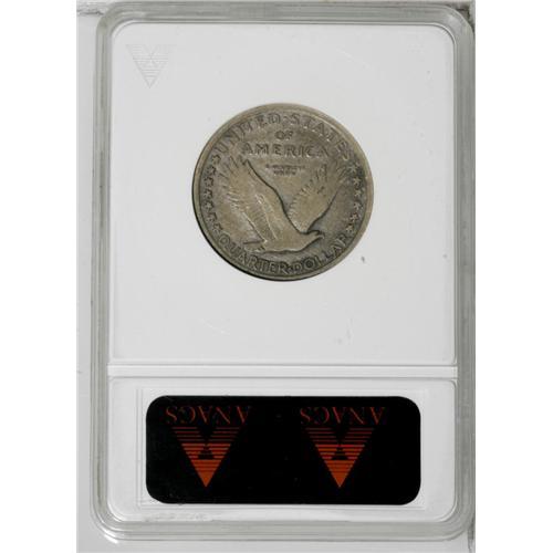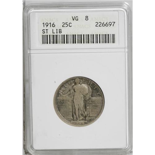 <B>1916<25C> VG8 ANACS.</B></I> Heavily worn over the design elements, more than half of the digits in the date remain, however, making the year of issue indisputable. The tan-golden surfaces show deeper charcoal accents around the devices. The only mark of consequence is a diagonal scratch in the field between the eagle's wings.