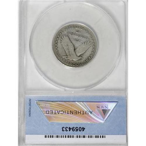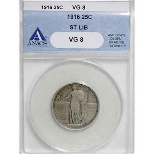 <B>1916 25C VG8 ANACS.</B></I> This is an attractive key-date quarter for having seen fairly heavy circulation. The obverse assumes a semi-bright golden-gray tint, while the reverse takes on light gray patination. The coin is lightly abraded for the grade, though some faint slide marks are noted on the obverse. Both sides are well detailed, except that the very tops of the date digits are lightly worn. An appropriate addition for a low to medium-grade collection.<BR><BR><b>Shipping:</b> Coins & Currency (<a target="_blank" href="http://www.heritageauctions.com/common/shipping.php">view shipping information</a>)