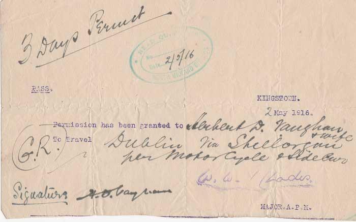 Military travel permit issued to Herbert D. Vaughan of Kingstown, Co. Dublin to allow him and his wife to travel to Dublin via Stillorgan on a motorcycle and sidecar from the 2nd until the 5th of May 1916. With the stamp of the headquarters of the 59th (North Midland) Division of the British Army who were sent to Dublin to quell the Rebellion. Also with another similar travel permit giving Herbert Vaughan permission to travel to County Meath. (2 items)