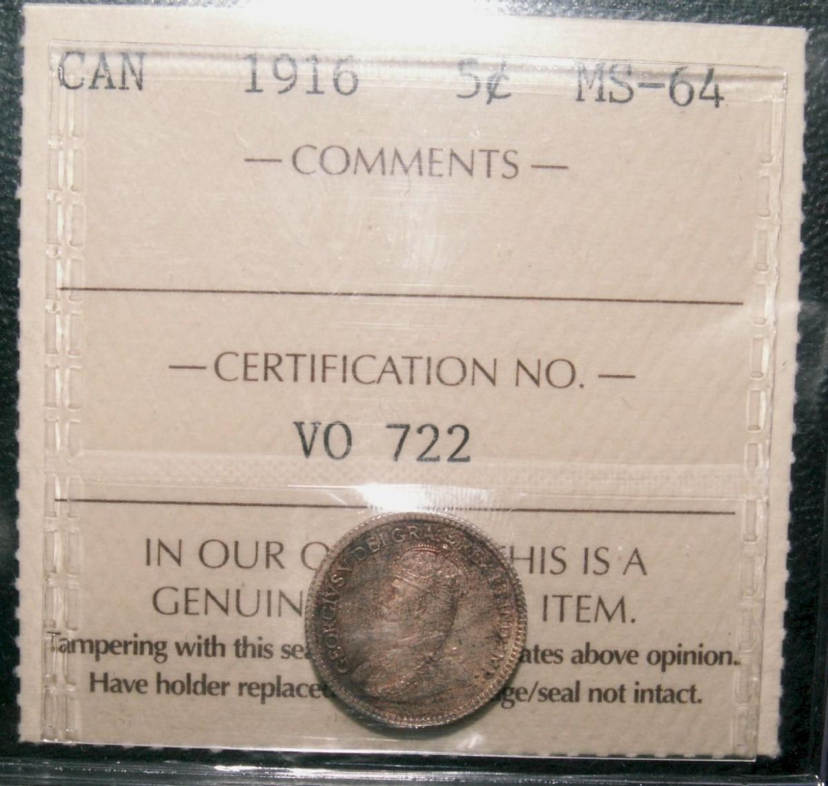 1916 5¢ ICCS MS64. Mintstate example with toning.
