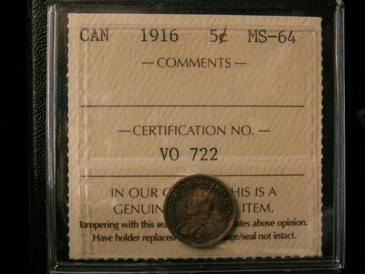1916 5¢ ICCS MS64. Mintstate example with toning.