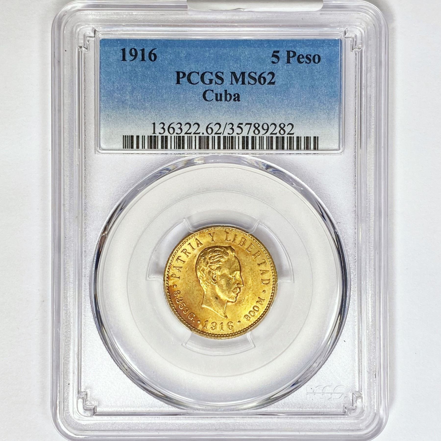 1916 5 Pesos .24oz Cuban Gold PCGS MS62