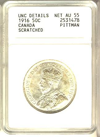 1916 50¢ ANACS AU55. Pittman example. Designated with scratch.