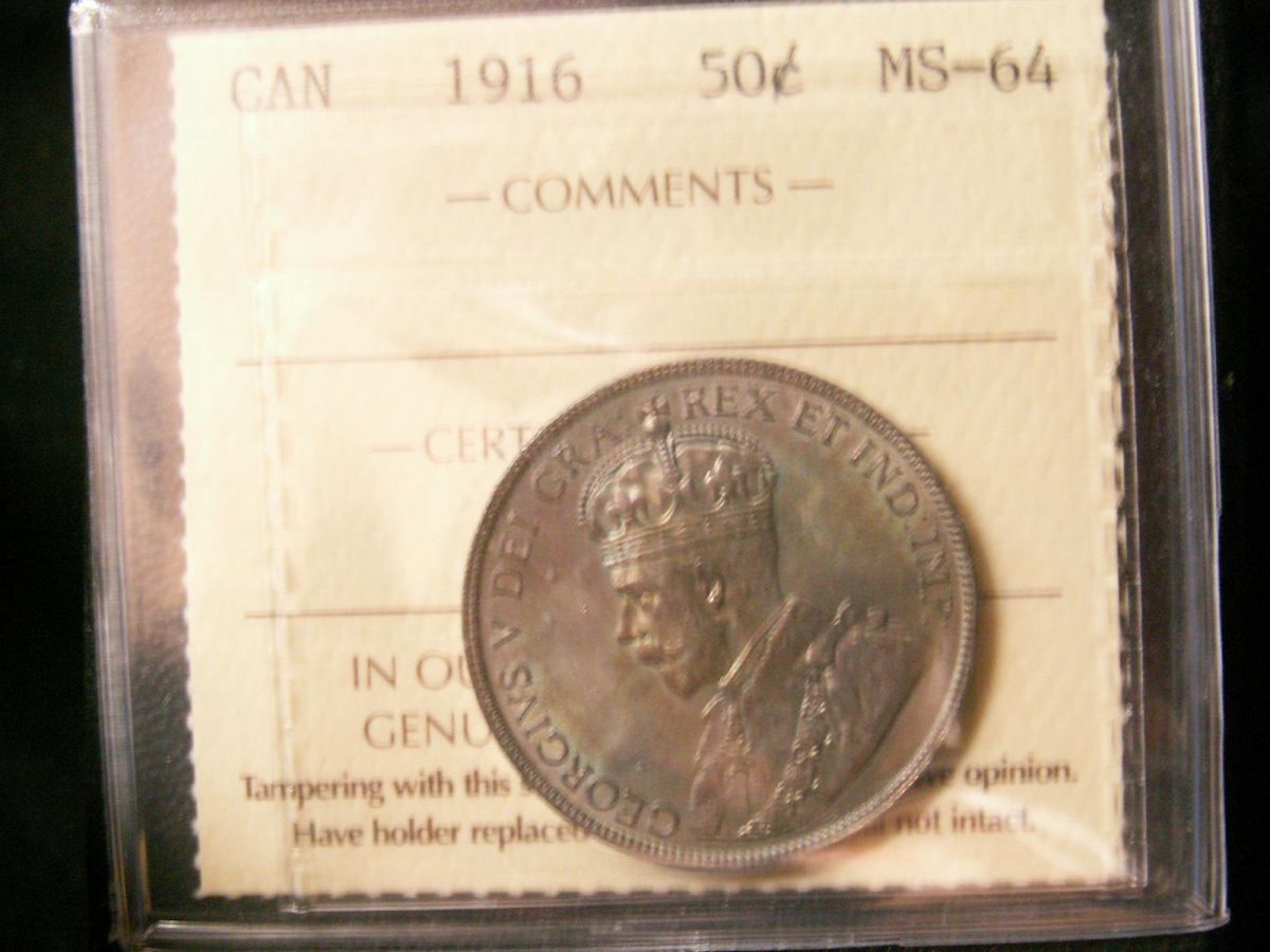 1916 50¢ ICCS MS64. Tones of purple over nice lustre. Excellent strike with clean fields and nice surfaces.