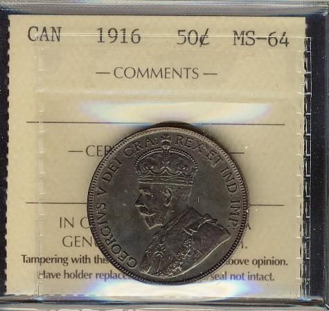1916 50¢ ICCS MS65. Lovely toning with underlying lustre. RARE.