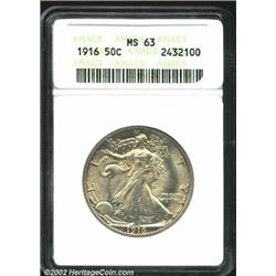 1916 50C MS63 ANACS. The borders have faintly speckled green-gray patina. Despite a couple of stray minor contact marks, this lustrous specimen has pleasing eye appeal due to the lovely matte-like surfaces. Important notice: We expect to be auctioning lots at the rate of 200-250 per hour. Sometimes eBay Premier live bid software cannot keep up with that pace, so we strongly recommend that you place a realistic proxy bid now as insurance to avoid disappointment. Also please note that all Heritage/CAA lots purchased through eBay Premier carry a 20% Buyer's Premium. Please make sure you read the Terms and Conditions.