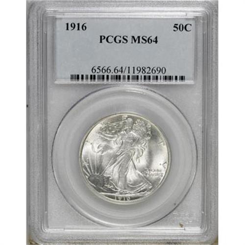 <B>1916 50C MS64 PCGS.</B></I> . PCGS Population (343/251). NGC Census: (291/207). Mintage: 608,000. Numismedia Wsl. Price for NGC/PCGS coin in MS64: $725. (#6566)<BR><BR><B>Coin Engraver:</B> Adolph A. Weinman<BR><BR><b>Shipping:</b> Coins & Currency (<a target="_blank" href="http://www.heritageauctions.com/common/shipping.php">view shipping information</a>)