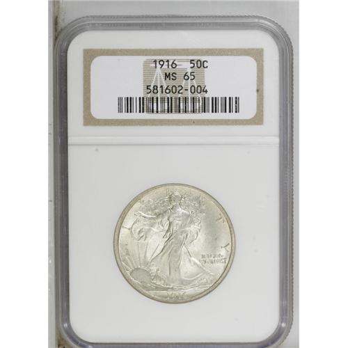<B>1916 50C MS65 NGC.</B></I> A thin coat of champagne-gold color adheres to lustrous surfaces that are devoid of significant marks. The design elements are well impressed.<BR><BR><b>Shipping:</b> Coin/Currency (<a target="_blank" href="http://www.heritageauctions.com/common/shipping.php">view shipping information</a>)