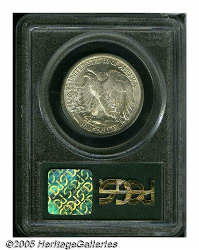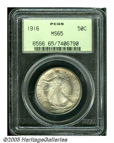 <B>1916<50C> MS65 PCGS.</B></I> This is a gorgeous Gem with frosty mint luster and heather toning. This is the first year of issue for Weinman's famous Walking Liberty (or Liberty Walking, depending on your preference) design, which remained in use until 1947.