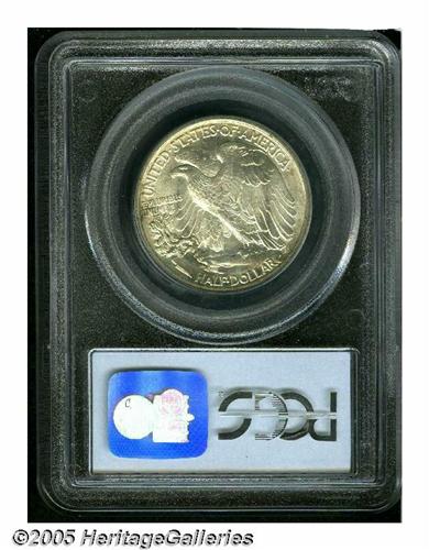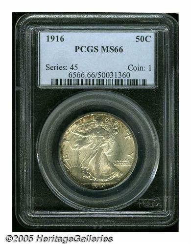 <B>1916<50C> MS66 PCGS.</B></I> This is an outstanding representative of the first year of issue. The design was prepared by sculptor and engraver Adolph A. Weinman, and is considered by many to be one of the two most beautiful designs ever to appear on United States coinage. The mintage was limited to just 608,000 coins, although quite a number of high-grade examples survive, no doubt saved as representatives of a new issue. Few of these historic mementos can compare with this Gem. It is sharply struck and fully brilliant with frosty silver luster. The obverse has splashes of golden-brown toning along much of the border while the reverse is essentially untoned with only a few faint speckles of color. Population: 62 in 66, 4 finer (6/05).<BR><I>From The Robert Moreno Collection.</B></I>