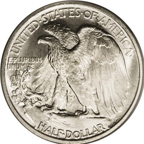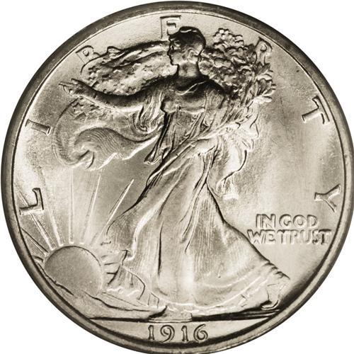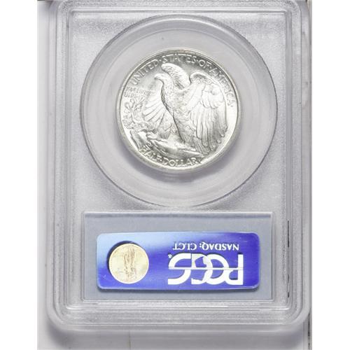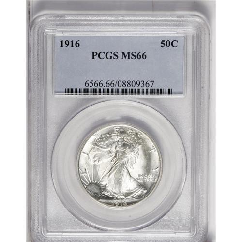 <B>1916<50C> MS66 PCGS.</B></I> This satiny specimen boasts unusually full luster emanating from the abundant die lines visible through the fields. Just a hint of milky tan color separates this half dollar from being fully white. The 1916 is extremely difficult to find in a higher grade, with only four finer pieces known to PCGS as of (8/06). Discriminating bidders will be rewarded by examining this Premium Gem personally.<BR><I>From The Big Tex Registry Set of Walking Liberty Halves.</B></I>