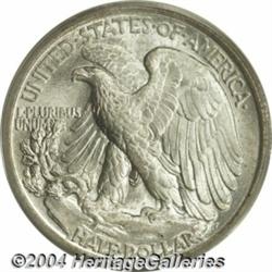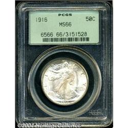 <B>1916<50C> MS66 PCGS.</B></I> A simply beautiful Gem, the surfaces are fully lustrous with the fine granularity often associated with first-year Walkers. Both sides are sharply struck, and there is not a singularly mentionable abrasion. Delicate pastel-lilac iridescence shimmers over the sharp features in a slightly mottled fashion. While this first-year P-mint issue is relatively common in lower grades, premium quality Gems are few and far between in today's market. Population: 58 in 66, 4 finer (7/04). <BR><BR><B>Important notice:</B> Heritage usually auctions material at the rate of 200-250 lots per hour. On some occasions eBay Live bid software or the Internet may not be able to keep up with the pace of the auction. We recommend placing a realistic absentee bid now as insurance to avoid disappointment. Occasionally the auctioneer may eliminate or reject an eBay Live bid, and the auctioneer may also reopen a lot after the close of the eBay live bidding (usually because we missed an audience bid), and may reject your bid even if it shows you as the winning bidder. By bidding via eBay Live, you agree that Heritage may award the lot to another bidder at its sole discretion under the circumstances described above or any other reasonable circumstances. Since eBay bids are not shown to us until we open the lot on the floor, we treat those bids just like floor bids. In most cases the floor responds before the eBay bid is presented to us, due to Internet lag time, so for consistency we have made it a policy that floor bids are always considered first over tie eBay live bids. Also please note that all Heritage lots purchased through eBay Live carry a 20% Buyer's Premium. Please make sure you read the Terms and Conditions before you bid. </span></font></tr></table></td></tr></table>