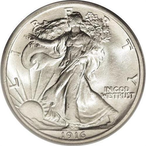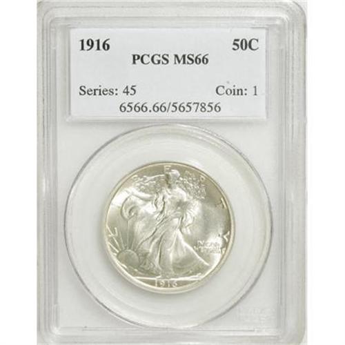 <B>1916 50C MS66 PCGS. CAC.</B></I> A delicately toned and lustrous representative with an exceptionally unabraded obverse. The reverse field is also beautifully preserved. Among Philadelphia issues, only the 1921 has a lower mintage. The 1916 is also targeted by first-year type collectors. Struck from noticeably rotated dies.<BR><I>From The Parker Lee III Collection.</B></I><BR><BR><B>Coin Engraver:</B> Adolph A. Weinman<BR><BR><b>Shipping:</b> Coins & Currency (<a target="_blank" href="http://www.heritageauctions.com/common/shipping.php">view shipping information</a>)