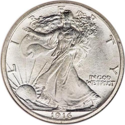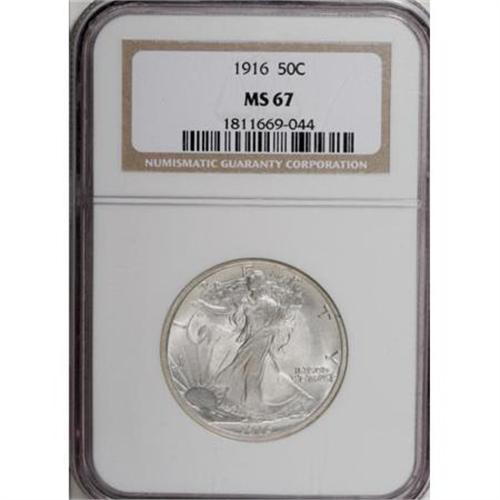<B>1916 50C MS67 NGC.</B></I> Finely grained surfaces exhibit frosty and fully brilliant silver luster with no indication of toning on either side. This piece has a similar appearance to earlier and smaller denomination pieces struck in matte proof format. The strike is remarkable for this date, the first Walking Liberty half dollar issue. Census: 8 in 67, 1 finer (10/07).<BR><BR><B>Coin Engraver:</B> Adolph A. Weinman<BR><BR><b>Shipping:</b> Coins & Currency (<a target="_blank" href="http://www.heritageauctions.com/common/shipping.php">view shipping information</a>)
