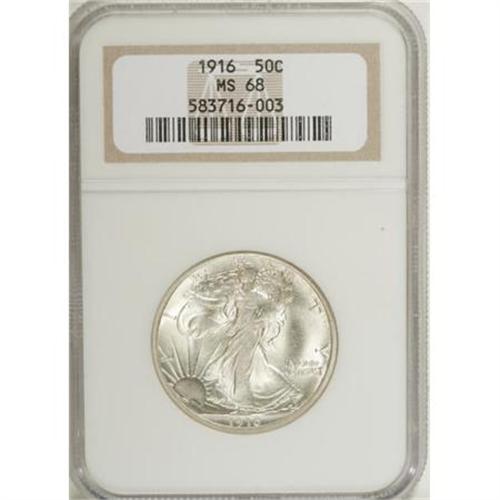 <B>1916 50C MS68 NGC.</B></I> The 1916 half dollar, with its 608,000-piece mintage, was saved in relatively large numbers, as is typical for most first-year-of-issue coins. NGC/PCGS census/population figures reflect this, showing nearly 2,000 Mint State pieces certified by the two services. The date is readily available through near-Gem, and even Gem and Premium Gem specimens are obtainable with patience and searching. MS67 pieces are rare, and a mere solitary coin (the example in this lot) has been certified in the lofty grade of MS68.<BR> Gorgeous satiny surfaces display potent luster and are nearly untoned, save for barely discernible wisps of light tan and ice-blue. A powerful strike emboldens the design features, including virtually full definition in Liberty's left hand and the adjacent branches. As is typical with all issues through 1921, Liberty's gown lines are weak. Bruce Fox (1993) attributes this to the "... lack of engraving details on the working dies and/or weaker than needed striking force on the presses dialed in to preserve the dies." Both sides are impeccably preserved. The Walking Liberty half aficionado will not want to miss out on this unbelievable coin!<BR><I>From The Vanek Collection.</B></I><BR><BR><b>Shipping:</b> Coins & Currency (<a target="_blank" href="http://www.heritageauctions.com/common/shipping.php">view shipping information</a>)