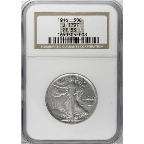 <B>1916 50C Walking Liberty Half Dollar, Judd-1992, formerly Judd-1797, Pollock-2053, Low R.7, PR53 NGC.</B></I> A significant 20th century pattern with LIBERTY (appearing as LiberTy) and IN GOD WE TRUST in large letters in the right obverse field. The reverse features an eagle that is a likeness of the final version of the Walking Liberty design, but with there the similarity ends. Above the eagle are the legend UNITED STATES OF AMERICA and HALF DOLLAR, while E PLURIBUS UNUM appears beneath the branch on which the eagle is perched. There are several different variations of 1916 Walking Liberty Half Dollar patterns known. The earlier issues and the eighth edition of the Judd reference listed six varieties, while Andrew Pollock included a seventh variety. Based on the pedigree research of Saul Teichman on his uspatterns.com website, only about 20 examples of all different varieties are currently known. Five of these are in the Smithsonian Institution, leaving a net available population of just 15 coins.<BR> Collectors were essentially unaware of the prototype 1916 strikings until the late 1930s when one was described in the April 1937 issue of <I>The Numismatist.</B></I> In what is relatively recent research, Mint Director Robert Woolley discussed the new design in his annual report for the fiscal year ending June 1916: "The obverse of the half dollar bears a full length figure of Liberty with a background of the American flag flying to the breeze. The goddess is striding toward the dawn of a new day, carrying laurel and oak branches, symbolic of civic and military glory. The reverse shows an eagle perched high up on a mountain crag, wings unfolded. Growing from a rift in the rock is a sapling of mountain pine, symbolic of America." The differences between these prototype strikings and the adopted design are sufficient enough for Dave Bowers to suggest: "...the Adolph A. Weinman designs for the 1916 'Mercury' dime and the 1916 Liberty Walking half dollar were made to illustrate general concepts rather than as a proposal for a completely finished design."<BR> The specimen offered here appears to have been carried as a pocket piece or perhaps even circulated for a brief period of time. If so, imagine the curious looks it may have received or the elation upon its eventual discovery. The surfaces are a bright silver-gray and reveal a few light scratches on the major design elements upon close inspection, most notably on the eagle's forewing. A small lump of extra metal on the reverse border above ED of UNITED is useful for future attribution. A fascinating prototype for one of the most widely collected and beautiful designs in 20th century American numismatics.<BR><BR><b>Shipping:</b> Coin/Currency (<a target="_blank" href="http://www.heritageauctions.com/common/shipping.php">view shipping information</a>)