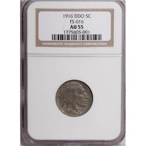 <B>1916 5C Doubled Die Obverse AU55 NGC.</B></I> FS-016. This variety is an extremely important issue in the Buffalo nickel series, and is accorded the special honor of its own listing in the <I>Guide Book</B></I> where it has been listed since the late 1970s.<I> </B></I>While many varieties have been added to the listings of this annual reference in recent years, the '16 doubled die nickel, the '55 doubled die cent, and a few others have been included for many years.<BR> This is a pleasing example with sharp doubling on the obverse. Both sides retain nearly full mint luster beneath dark gray-gold toning with hints of iridescence. Although a few faint surface marks are evident, neither side has any noticeable distractions to be concerned about.<BR> While doubled die varieties exist in nearly every series of copper, nickel, silver, and gold coinage, few are as dramatic as this example. Some of the more visible doubled dies, such as the 1873 Indian cent, the 1955, 1969-S, 1972, 1983, and 1984 Lincoln cents, and this 1916 nickel, are listed in the <I>Guide Book.</B></I> There are many other doubled die varieties that are less obvious, and these are listed in important references such as Breen's <I>Complete Encyclopedia,</B></I> and the <I>Cherrypickers' Guide </B></I>by Fivaz and Stanton.<BR> In <I>The Complete Guide to Buffalo Nickels, </B></I>David Lange notes that this important variety has been known since its first publication in the July 1962 issue of <I>The Numismatic Scrapbook</B></I> magazine. The discovery was announced by Herbert Perlin of Pomona, California, and yet the variety was not familiar with most collectors until the 1970s when it was described in the September 1976 issue of <I>The Coin Dealer Newsletter.</B></I> It is fascinating to ponder why a variety of this magnitude, struck in Philadelphia, was discovered on the other side of the country.<BR><BR><b>Shipping:</b> Coins & Currency (<a target="_blank" href="http://www.heritageauctions.com/common/shipping.php">view shipping information</a>)