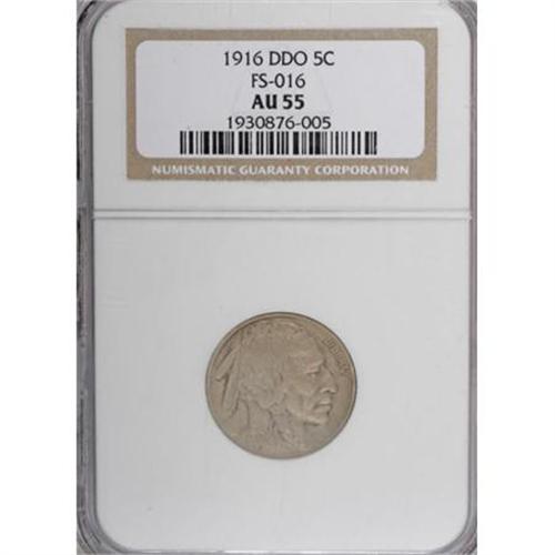 <B>1916 5C Doubled Die Obverse AU55 NGC.</B></I> FS-016. Medium yellow-gray as typically seen on circulated Buffalo nickels, but this is the coveted and elusive 1916 Doubled Die obverse. Note the doubling on the Chief's feathers, ribbons and neck, and of course the date. These elements are strongly preserved on a coin of this grade, and quickly faded away as these circulated into lower grades as normally encountered. Slight streaking can be seen with a loupe, and scattered handling marks from brief circulation.<BR> The 1916 Doubled Die, the 1918/7-D Overdate, and the 1937-D Three-Legged varieties are three special Buffalo nickel issues that are aggressively sought by novice collectors and specialists alike. This is because all three varieties are recorded in the annual editions of the <I>Guide Book of United States Coins</B></I>, published by Whitman. The variety was first publicized in 1962 and first listed in the <I>Guide Book</B></I> in 1978.<BR> With the meticulous record-keeping of the grading services, collectors finally have a glimpse into the true rarity of most United States coins. Most of the key date rarities have been certified after over 20 years of submissions, and any dates relative rarity can be determined in any particular grade. In the case of the 1916 Doubled Die nickel, NGC reports 19 pieces graded this high, with an additional 13 coins graded finer. A foremost rarity in any grade, and highly desirable in such a loft state of preservation.<BR><I>From The Madison Collection.</B></I><BR><BR><B>Coin Engraver:</B> James E. Fraser<BR><BR><b>Shipping:</b> Coins & Currency (<a target="_blank" href="http://www.heritageauctions.com/common/shipping.php">view shipping information</a>)