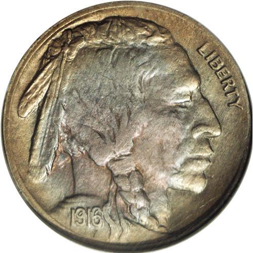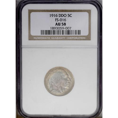<B>1916<5C> Doubled Die Obverse AU58 NGC.</B></I> FS-016. The Doubled Die 1916 is the key date to a complete <I>Guide Book</B></I> collection of Buffalo nickels. It is even tougher than its closest competitor, the 1918/7-D. Both varieties are rare because their significance was not recognized for many years after their production, by which time most survivors were circulated. There was little reason to save a 1916 nickel in Mint State, since its mintage of nearly 63.5 million pieces was the highest of the type aside from the 1936 and 1937. One must wonder how many collectors over the years received an example, noticed the wide die doubling on the date, then spent the piece because the 1916 was a "common date." The variety did not appear in the <I>Guide Book</B></I> until the 1978 edition. Breen notes in his 1988 <I>Encyclopedia,</B></I> "Ex. rare. Usually in low grades." As a result, the two leading grading services, NGC and PCGS, have certified a total of just 13 pieces across all Mint State grades, some of which may be resubmissions.<BR> This sharp example shows slight wear on the hipbone, which prevents an Uncirculated grade. The subtle multicolor toning is attractive, and offers lilac, powder-blue, and tan tints. Neither side reveals any reportable marks, and the overall appearance is pleasing. The obverse die doubling is strongest on the 6 in the date, but the other three date digits are also widely doubled, with a lighter impression from the initial hubbing. All three feathers are die doubled at their bases. LIBERTY is not die doubled, since the pivot point for the Class V doubling is within that legend. The absence of die doubling on LIBERTY probably delayed the reporting of the variety for many years, since doubled die varieties were inevitably compared with the 1955 DDO cent, which has dramatic Class I doubling. For Class I, the pivot point is the center of the die, and all peripheral elements exhibit a similar spread. The numismatic science of die varieties greatly advanced during the 1970s, to the benefit of important varieties such as the 1916 DDO nickel. Census: 6 in 58, 8 finer (2/06).