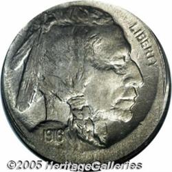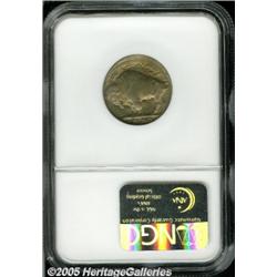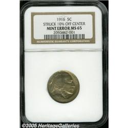 <B>1916 5C Error Buffalo Nickel--Struck 10% Off Center--MS65 NGC.</B></I> A wide arc of blank flan is seen on the lower obverse and upper reverse. The thick, satiny mint luster is overlaid by deep gray-olive toning on each side. Sharply defined.