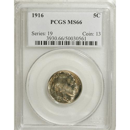 <B>1916 5C MS66 PCGS.</B></I> Attractive caramel-gold, powder-blue, and lilac patina endows this lustrous and intricately struck Premium Gem. An occasional orange-peel texture to the fields suggests the dies were long in use.<BR><BR><b>Shipping:</b> Coins & Currency (<a target="_blank" href="http://www.heritageauctions.com/common/shipping.php">view shipping information</a>)