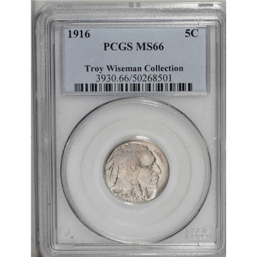 <B>1916<5C> MS66 PCGS.</B></I> Light pink and pale gold patina decorates this lustrous piece. Significant peripheral weakness is noted, especially at the TY of LIBERTY.<BR><I>From The Troy Wiseman Collection.</B></I>