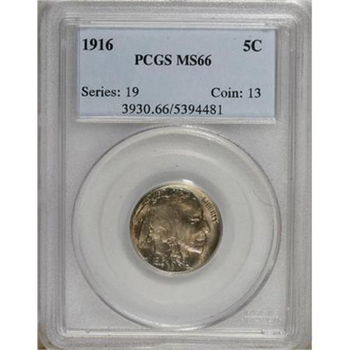 <B>1916 5C MS66 PCGS.</B></I> An original-looking specimen with lovely sky-blue, rose, olive, and gold toning. A few tiny marks are seen around the Indian's mouth. Overall, a well struck and eye-catching Premium Gem. <BR><BR><b>Shipping:</b> Coins & Currency (<a target="_blank" href="http://www.heritageauctions.com/common/shipping.php">view shipping information</a>)