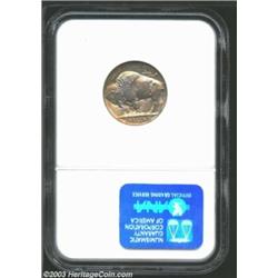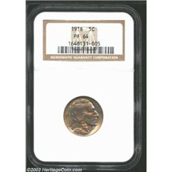 1916 5C PR64 NGC. This issue's limited original mintage of 600 pieces is almost certainly explained by the Mint's failure to achieve widespread approval for the specimen striking Buffalo Nickel. After having produced the type in proof format since 1913, the federal government had little to show for its efforts in the area of collector support. Once again, 1916 certainly witnessed the year-end destruction of countless unsold examples. Among the more carefully preserved of the elusive 1916-dated survivors is this originally toned near-Gem. Both sides display orange-tan peripheral color around centers that are either champagne tinged or blue-gray in appearance. Were it not for a relatively well concealed reverse spot on the bison's horn, this smooth, satiny example would probably warrant consideration at the PR65 level.From an East Coast cabinet. Important notice: We expect to be auctioning lots at the rate of 200-250 per hour. On occasion eBay live bid software cannot keep up with the pace of the auctions where 4-5 lots per minute can hammer down, so we recommend that you place a realistic absentee bid now as insurance to avoid disappointment. Also please note that all Heritage/CAA lots purchased through eBay Live carry a 20% Buyer's Premium. Please make sure you read the Terms and Conditions.