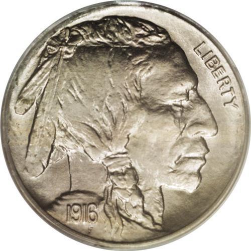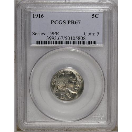 <B>1916<5C> PR67 PCGS.</B></I> Streaks of gold iridescence visit the primarily silver-blue Superb Gem. The strike is penetrating, even on such elements as the hair above the braid and the bison's tail. Occasional tiny gray flecks are of little import. Aside from the nebulous matte proof 1917, the 1916 is the scarcest proof issue in the series. Only 600 pieces were struck.