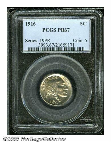 <B>1916<5C> PR67 PCGS.</B></I> When the novice collector thinks of matte proof coinage, the general picture in the mind is a dull, unappealing coin that would not make anyone happy. Nothing could be further from the truth, however, as this Superb Gem will demonstrate. The surfaces are essentially untoned but showing hints of rose toning. The devices are extremely sharp with every detail fully delineated. And the luster is exceptional with a satin finish. In fact, the term "satin proof" might be a better description for this delightful coin.