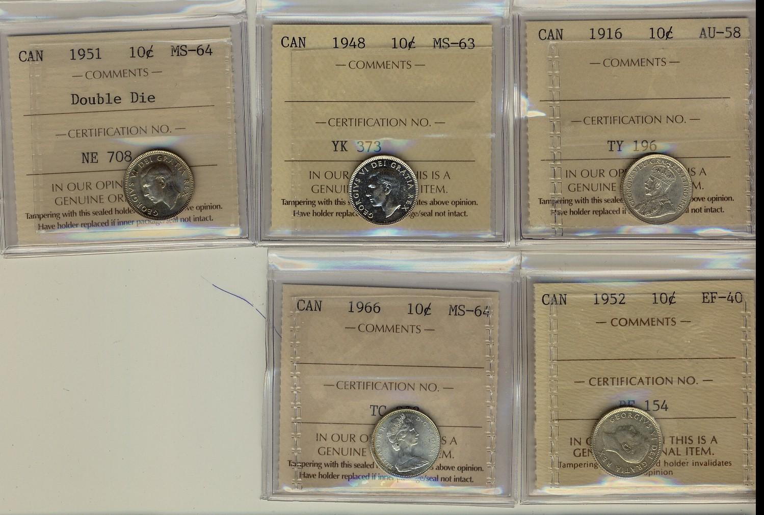 1916 AU58, 1948 MS63, 1951 DD MS64, 1952 EF40 & 1966 MS64 10¢. Lot of 5 dimes all ICCS graded.
