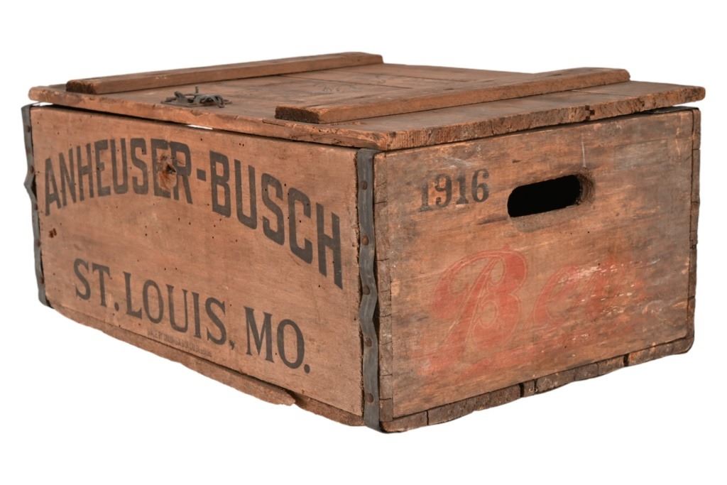 Very visible Reynard the Fox motif on top, complete with latch and reinforcements. BEVO was a non-alcoholic beverage made by Anheuser Busch from 1916-1929, helping the company flourish throughout prohibition. Measures 9.5" x 13.75" x 21".