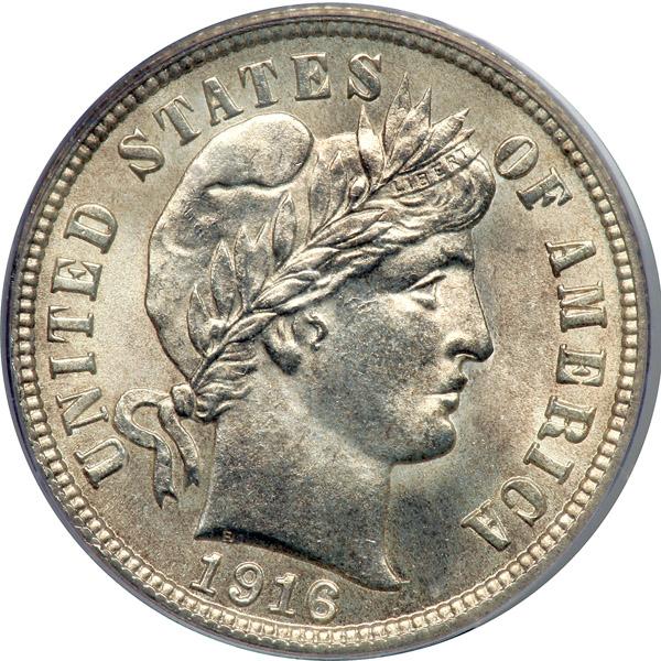 1916 Barber Dime. PCGS graded MS-64. Well struck and frosty, untoned (PCGS # 4870) .