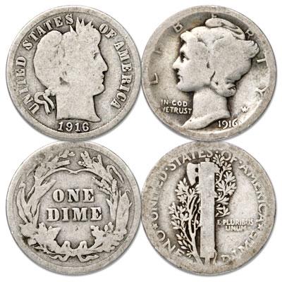 dimes of 1916 – Mercury dimes were to be released in 1916… but the new dies weren’t ready until late in the year! So the Barber design was continued to meet demand.