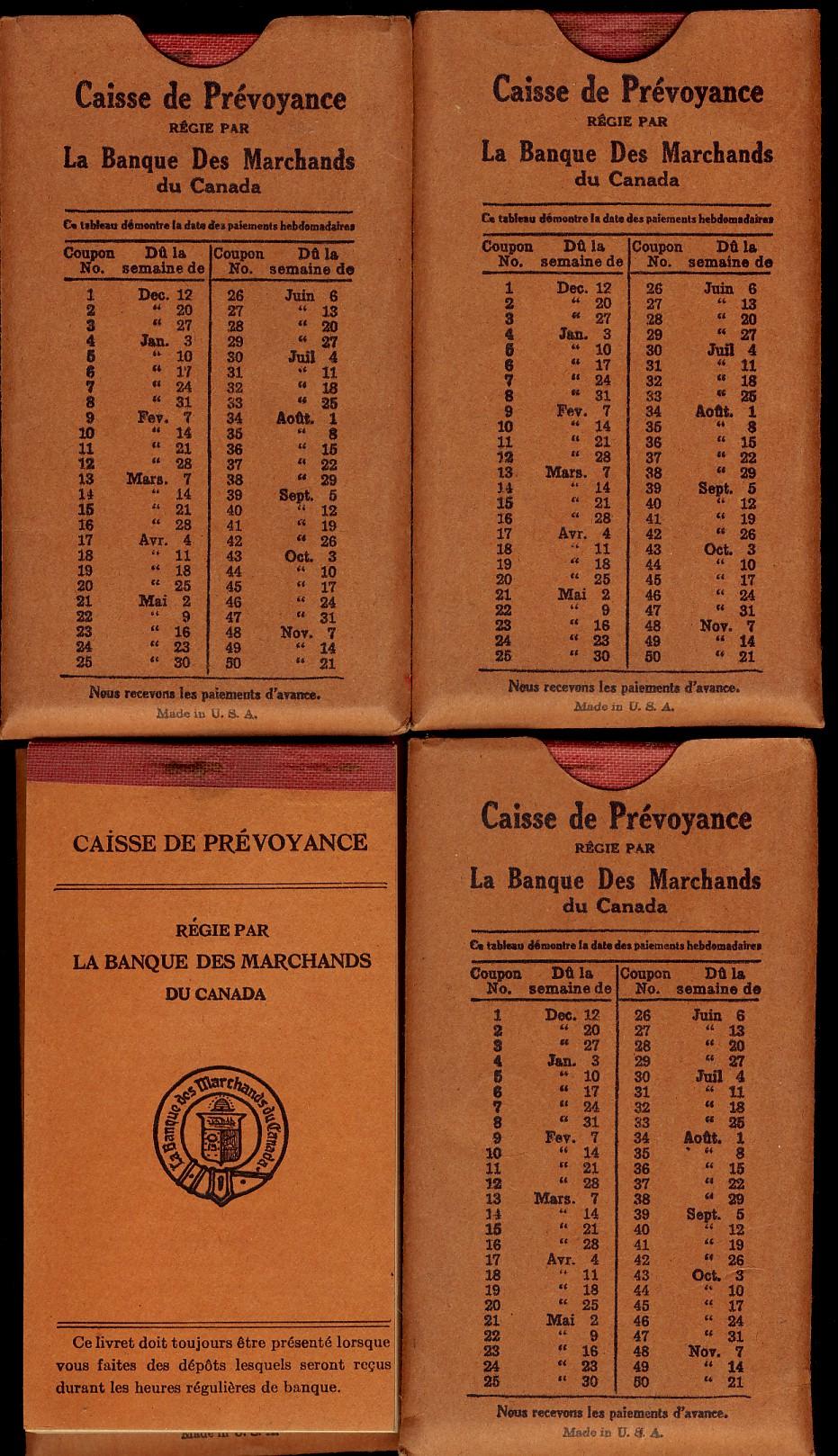 1916 Booklets from La Banque des Marchands du Canada-Caisse de Prévoyance. Includes 4 different booklets, two of which are of various denominations from 5¢ to $2.50 and the other two of fixed denominations 25¢ and the other $5. All booklets are like new.