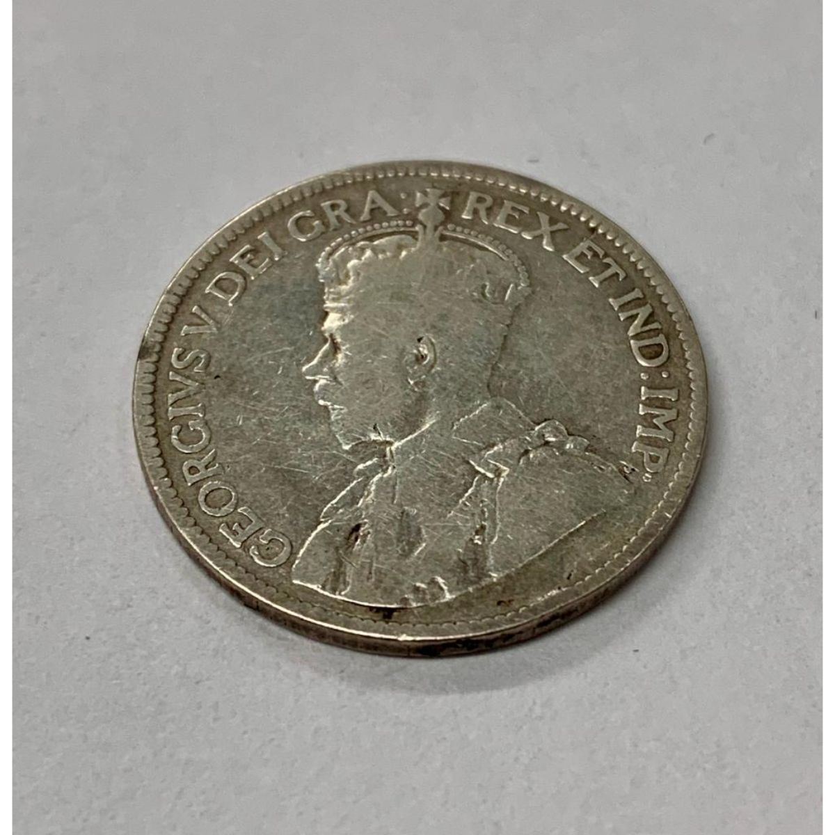 On the obverse side the portrait in left profile of George V is surrounded with the inscription "GEORGIVS V DEI GRA: REX ET IND:IMP" (George V, King and Emperor of India by the grace of God) Lettering:Â GEORGIVS V DEI GRA: REX ET IND:IMP: On the reverse the facial value, accompanied with the inscription "CANADA", is surrounded with two maple boughs and a crown Lettering:Â 25 CENTS CANADA 1914 Alloy: 92.5% silver, 7.5% copper