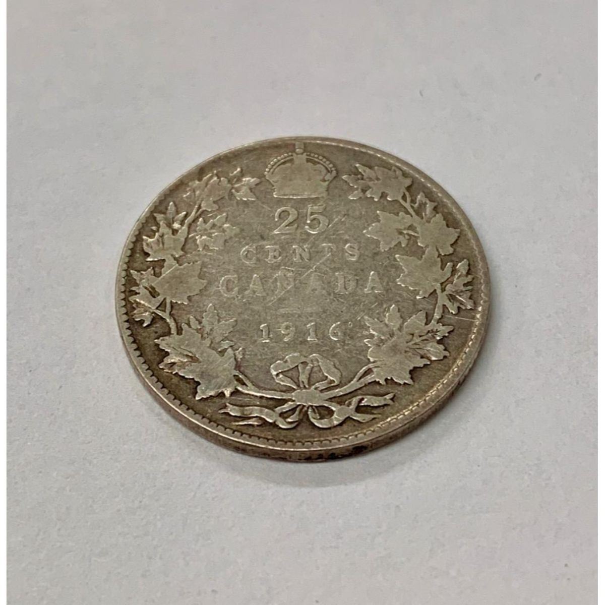 On the obverse side the portrait in left profile of George V is surrounded with the inscription "GEORGIVS V DEI GRA: REX ET IND:IMP" (George V, King and Emperor of India by the grace of God) Lettering:Â GEORGIVS V DEI GRA: REX ET IND:IMP: On the reverse the facial value, accompanied with the inscription "CANADA", is surrounded with two maple boughs and a crown Lettering:Â 25 CENTS CANADA 1914 Alloy: 92.5% silver, 7.5% copper