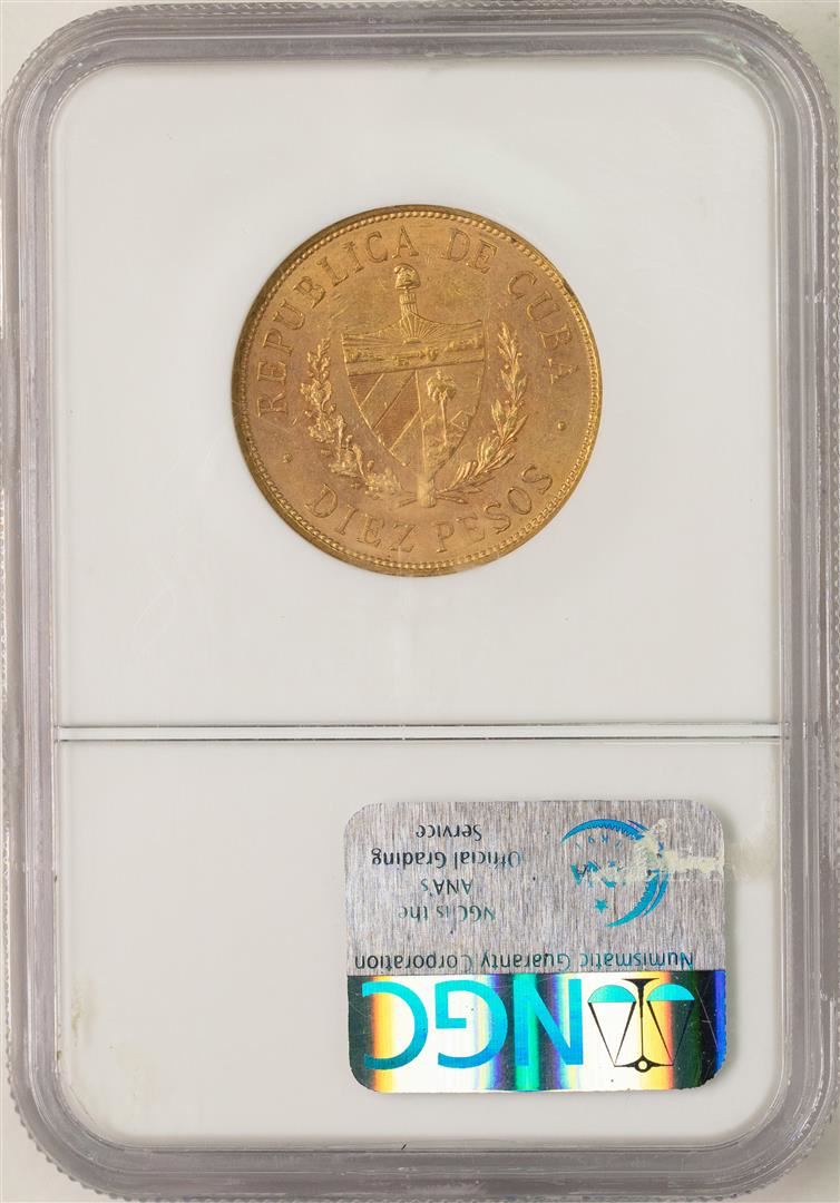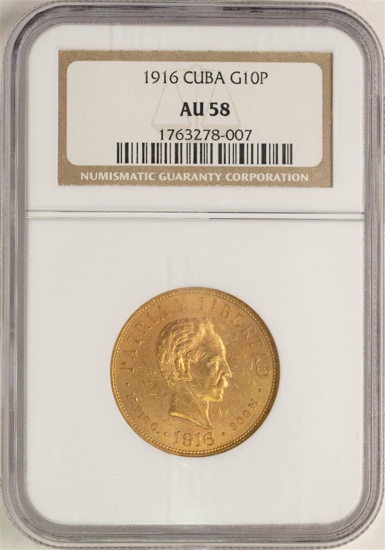 One 1916 Cuba 10 Pesos Gold Coin NGC AU58. NGC Certified.