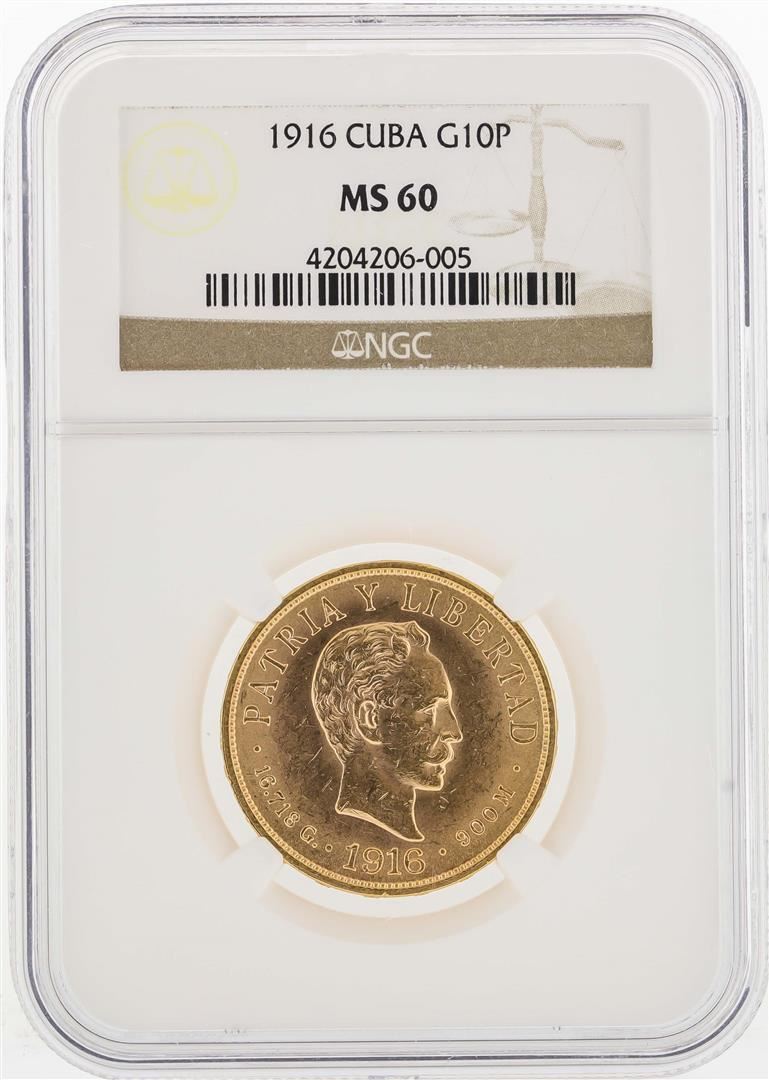 One 1916 Cuba 10 Pesos Gold Coin NGC MS60. NGC Certified.
