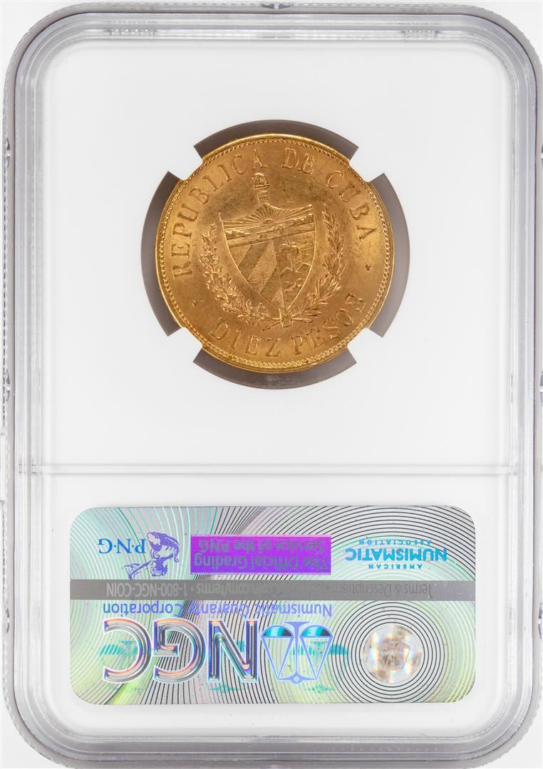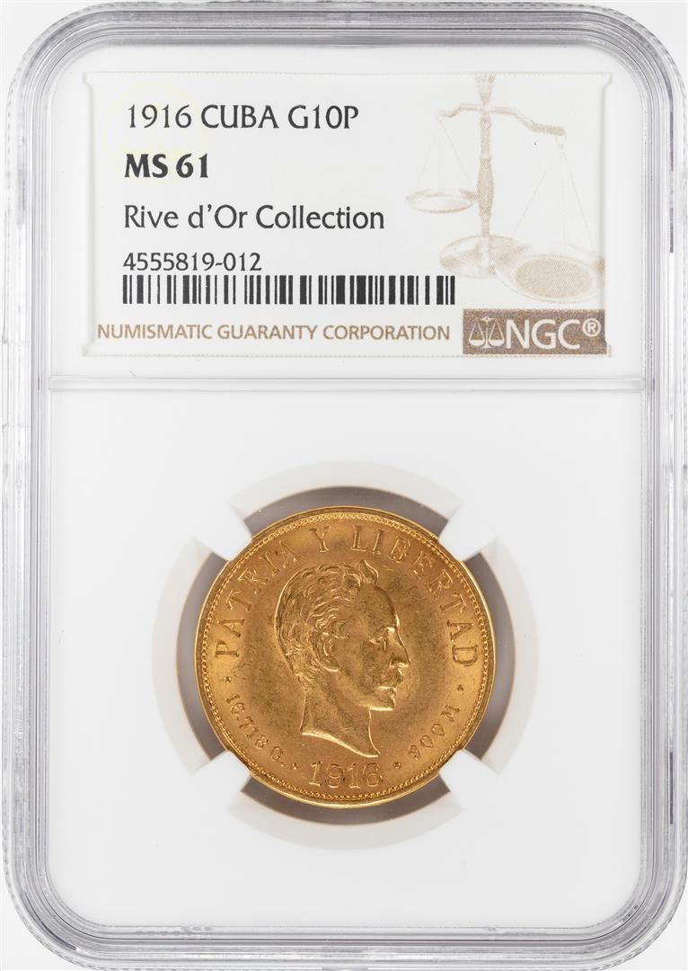 One 1916 Cuba 10 Pesos Gold Coin NGC MS61 Rive d'Or Collection. NGC Certified.