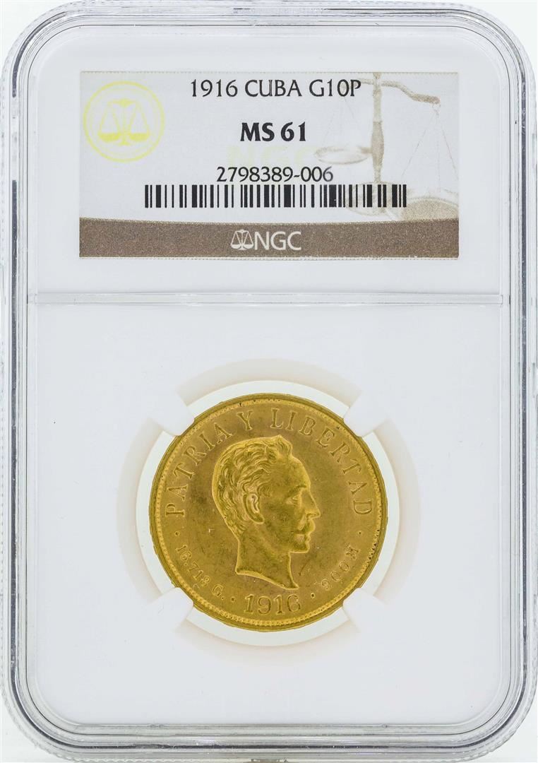 One 1916 Cuba 10 Pesos Gold Coin NGC MS61. NGC Certified.